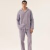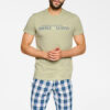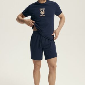 Wygodna piżama męska o luźnym, komfortowym kroju, idealna do snu i relaksu w domu. Koszulka z długim rękawem, okrągłym dekoltem i nadrukiem nadaje całości nowoczesny, casualowy charakter. Długie spodnie bez kieszeni zapewniają swobodę ruchów, a szeroka guma w pasie z nadrukiem gwarantuje idealne dopasowanie i komfort noszenia. Zestaw pakowany w pudełko, dzięki czemu świetnie sprawdzi się jako praktyczny prezent.