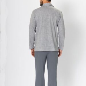 Klasyczna rozpinana piżama męska. Góra piżamy w jasnym kolorze z nadrukowanym subtelnym deseniem. Bluza posiada trzy praktyczne kieszenie obszyte kontrastowym wykończeniem. Satynowe wypustki w kolorze spodni podkreślają elegancki charakter tej piżamy. Spodnie długie o prostym, luźnym kroju.