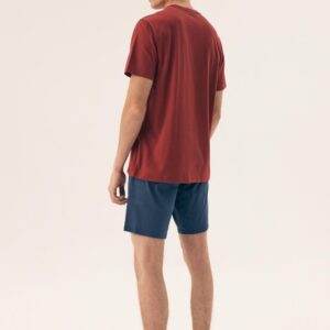 Wygodna i stylowa piżama męska, która łączy swobodny fason z nowoczesnym wyglądem. Góra zestawu to koszulka z krótkim rękawem, okrągłym dekoltem i modnym napisem, która świetnie sprawdzi się zarówno do spania, jak i na relaksujący wieczór w domu. Do kompletu dołączone są krótkie spodenki bez kieszeni, uszyte z miękkiej i przewiewnej tkaniny, idealnej na cieplejsze noce. Komfortowy krój oraz elastyczna guma w pasie z nadrukiem zapewniają wygodne dopasowanie i swobodę ruchów. To świetny wybór dla mężczyzn ceniących komfort, minimalizm i nowoczesny styl, idealny także na prezent.