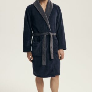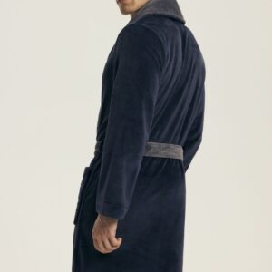 Elegancki szlafrok męski o luźnym, komfortowym kroju, wykonany z gładkiej tkaniny, która zapewnia przyjemne użytkowanie i klasyczny wygląd. Model z eleganckim kołnierzem i kieszeniami, łączący funkcjonalność z ponadczasowym stylem. Szlafrok ma długość przed kolano i wiązanie na pasek, umożliwiające idealne dopasowanie do sylwetki. Pakowany w woreczek foliowy, co czyni go praktycznym i wygodnym do przechowywania lub jako prezent.